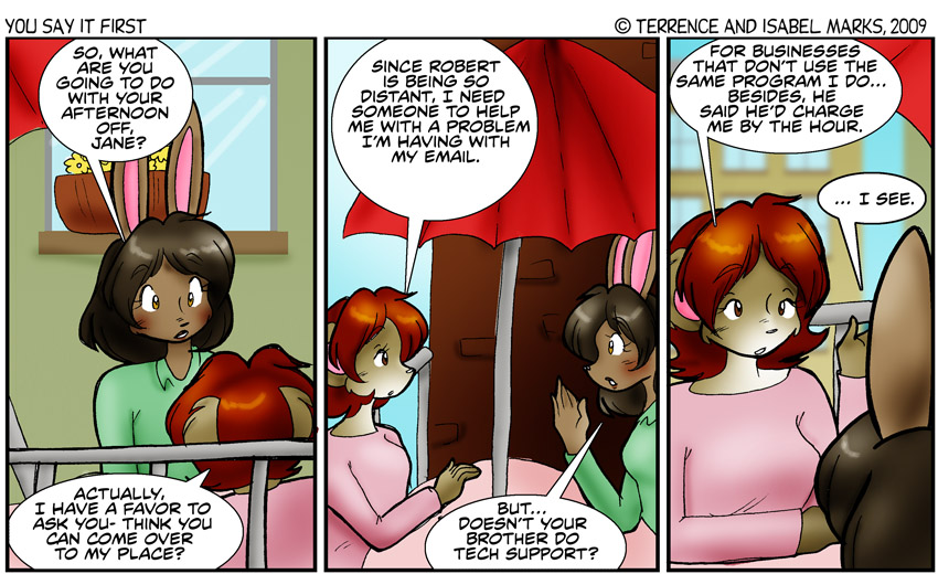 Original Commentary Back when I was trying to write this, I asked Terrence for a common email problem... he instead started mention commonly used email programs. A miscommunication... I think we were starting to get sick even back then. I then opened up my email program and started to poke around in it, seeing what could be changed to mess things up... I must have gotten it right because Terrence didn't mention anything wrong with it to me... but honestly, my days of knowing computers is long gone... -Isabel Modern Commentary |