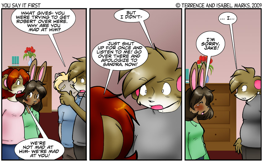 Original Commentary In panel three I was going to add a line in Jake's panel about him threatening Robert (along the lines of dragging him back if he had to- but taking a slight detour through some dirt first), but Terrence didn't really like it... and when one is congested and not making one sense, one should listen to the suggestions of others before their own. -Isabel Modern Commentary Regarding the previous commentary, I have to agree with Past Terrence - Jake is subtly threatening and adding more to that steals focus. "Lucy and Ethel" is a reference too the two female leads in the sitcom I Love Lucy who were famously involved in zany schemes. - Terrence |