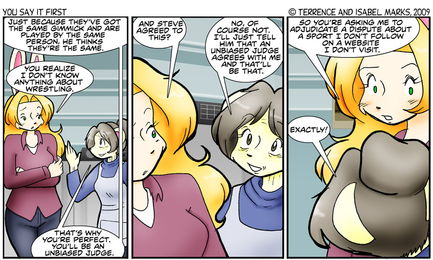 Original Commentary It's been a while since we've seen the laundry mat... at least in this comic. I know it's been seen in Grover Hills and Ten Minutes to... (now, that's a name I haven't seen in a while) but it's been years since it's been seen in the comic the background was made for. It's a shame too, I really like this one. It's also been a good long while since we've seen Lola and Kimberly... those two have a better relationship than Kimberly and her mother have- they have more conversations to. -Isabel Modern Commentary Ten Minutes To... was a different namirdeiter.net comic that featured four characters based on our real-life cats. Three of them also showed up in Joy's kindergarten class. I had wanted to put Leif, Miwa, and Susan in Nicole and Derek but never found the right place for them. - Terrence |