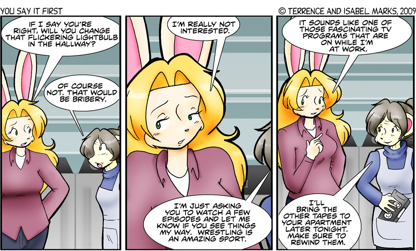 Original Commentary It had been my intention to make some new items for Jane's (and Jake's... although I doubt he's paying rent) living room from the start of it's showing (has Jane's place been shown before? Bah, if so she redecorated... nothing brings up a gal's spirits more than redecorating... or so I've heard- our own place is a designer's nightmare, so what would I know?), but we've both had sore throats for the last three days... we're getting better, but I just ended up not having much energy for the past few days, so in the end, the last two comics ended up having very plain backgrounds. Last night I was up till six am drawing today's comics- and even then I barely got them up at time...but at least I used the extra time I had today to make new backgrounds for this comic. The cabinet is new- the only thing borrowed are it's contents (the photo is one of Robert, Jane and Jake when they were kids... I have a feeling that photo has been up for years, even before Jane and Robert got together). The flowers are from Twix's flower shop (the ultimate recycling back ground file), the books on the bottom shelf are from Ya Ta comics and the collector's plate is new. There is also a brand new drawer to go with the cabinet, but it doesn't get much showing. The calendar is somewhat new... the image in it came from a really old ND comic. I'm glad I finally got to make them... just in time for them not to show up again for a bit. >< -Isabel Modern Commentary Sandra is, unfortunately, too nice to yell back at him - Terrence |